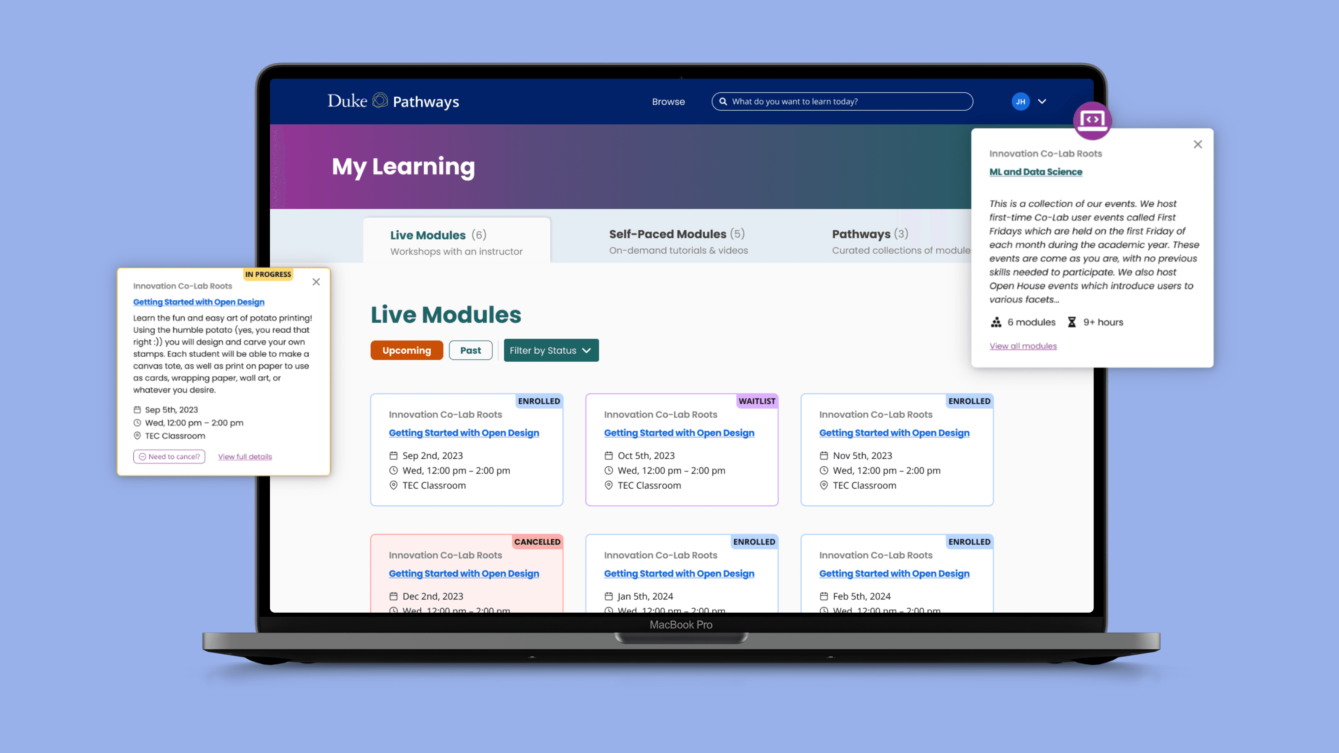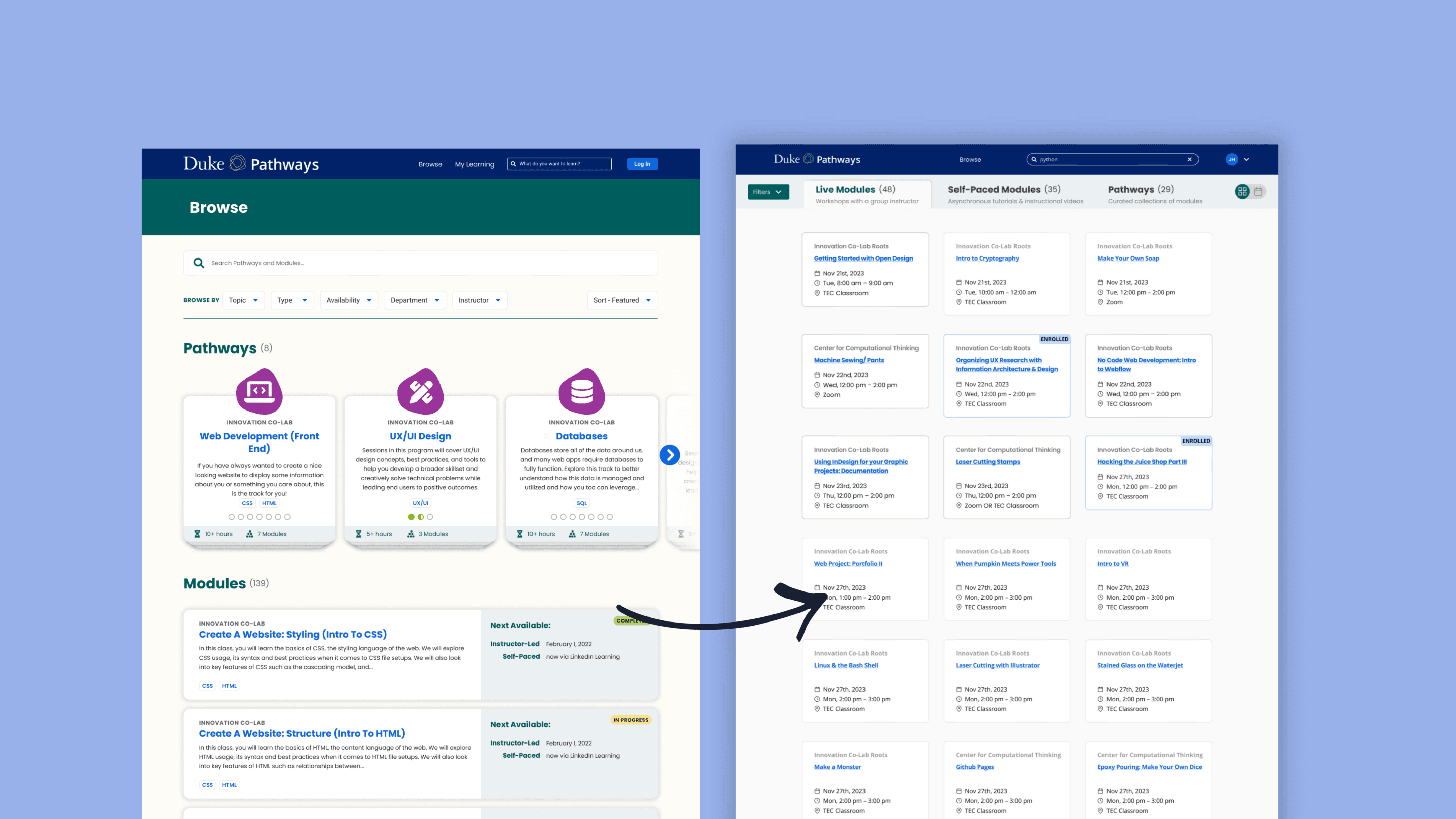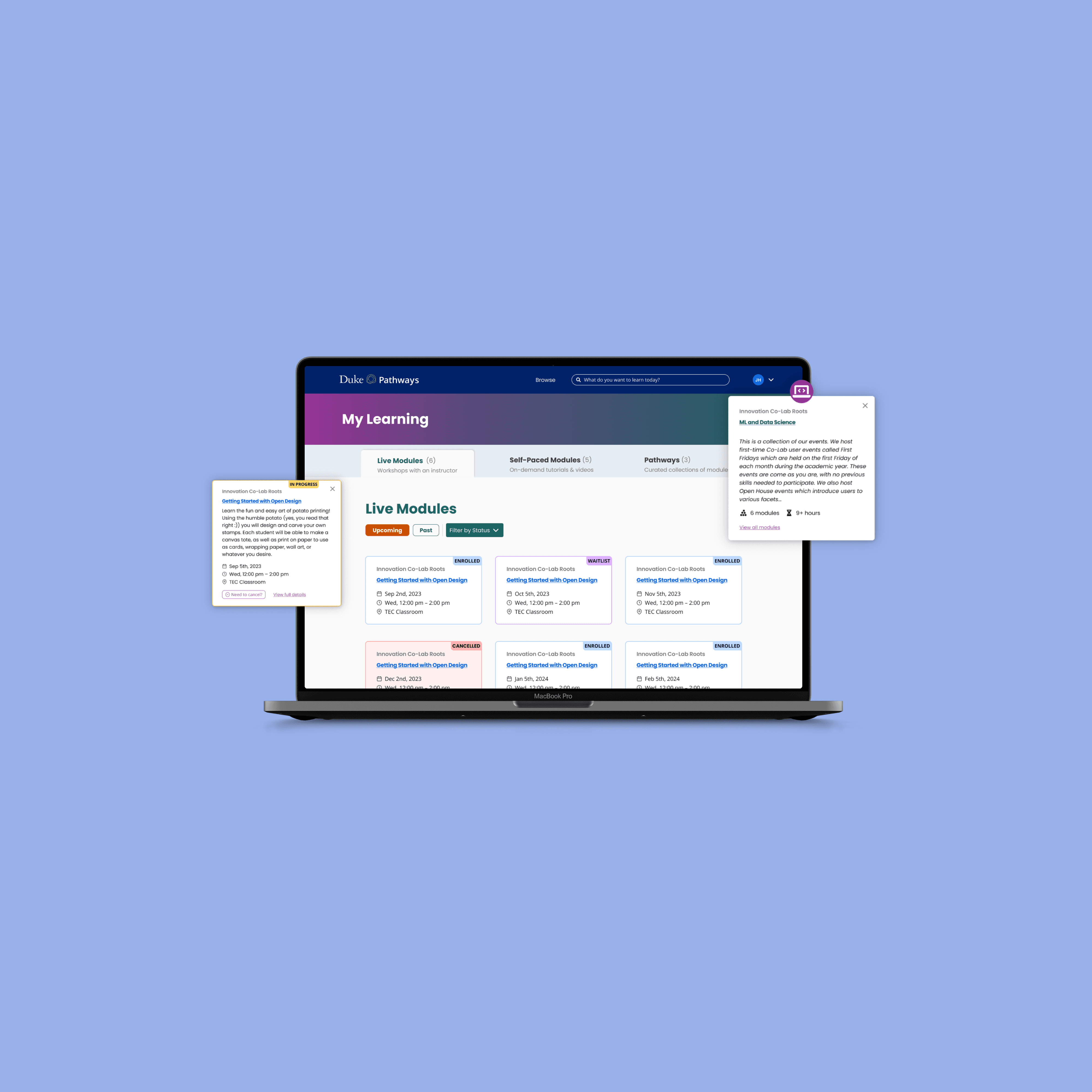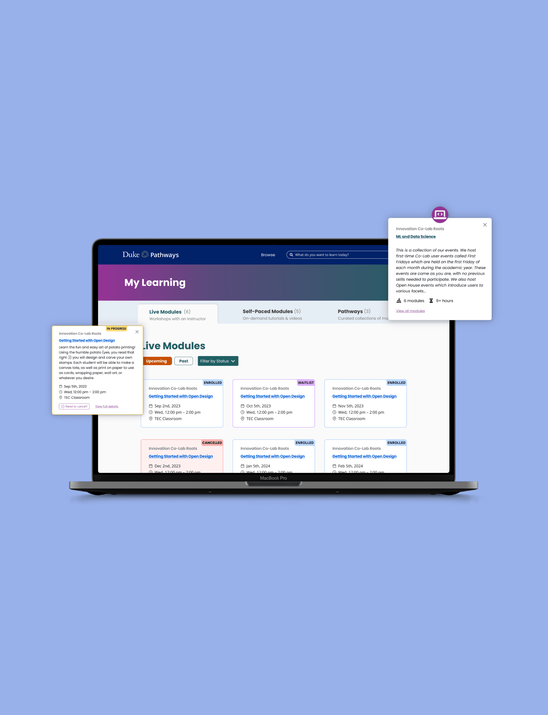 Pathways is Duke’s co-curricular learning platform, similar to Coursera. Students use it to join in-person workshops across a wide range of topics, from computer programming to soap making, and to complete self-paced modules.